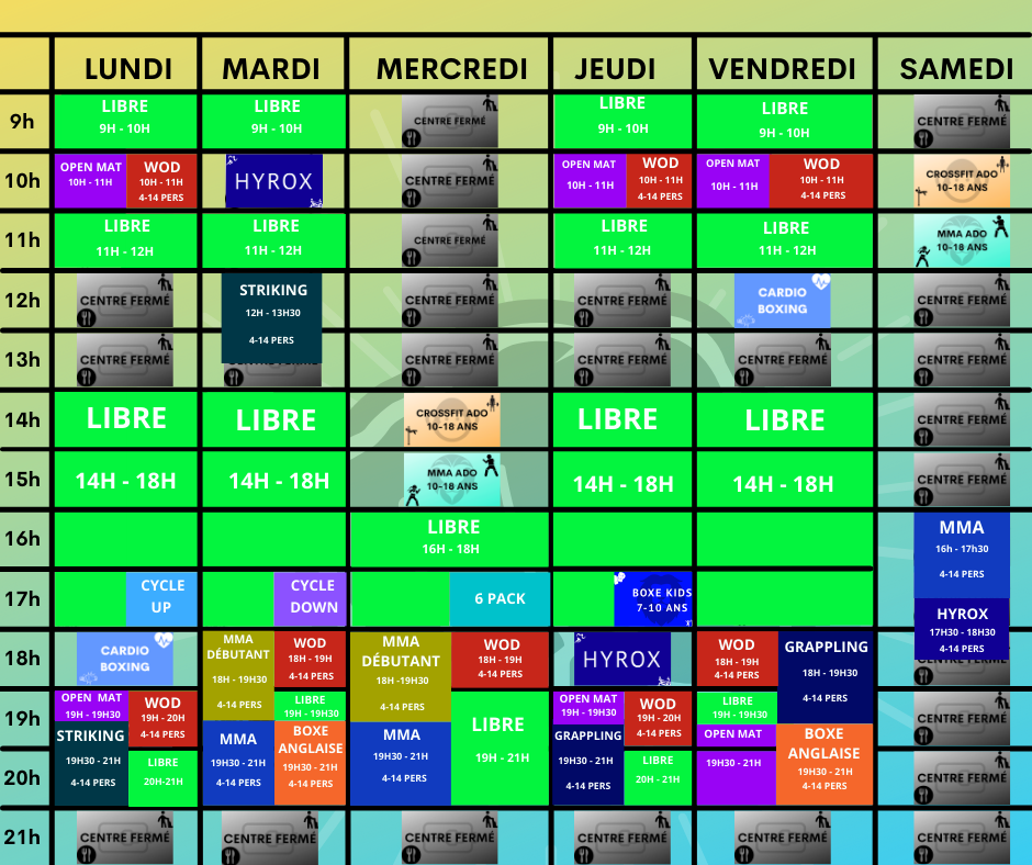 Si un cours est annulé et qu’il y a d’autres horaires de cours prévus ensuite, l’horaire se transforme en horaire de libre, dans le cas contraire le club peut fermer ses portes plus tôt pour les créneaux n’ayant pas lieu le soir.